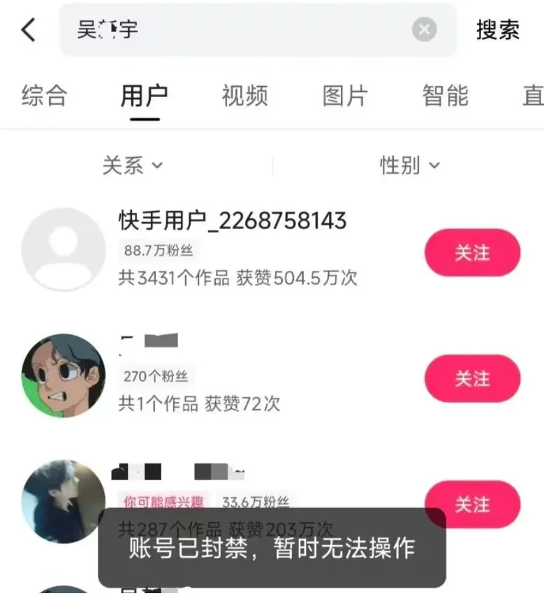 2月2日,“吴新宇”快手账号被封禁,抖音账号也无法被搜索到。其被封杀后,不少网友暗示:相聚不是法外之地。