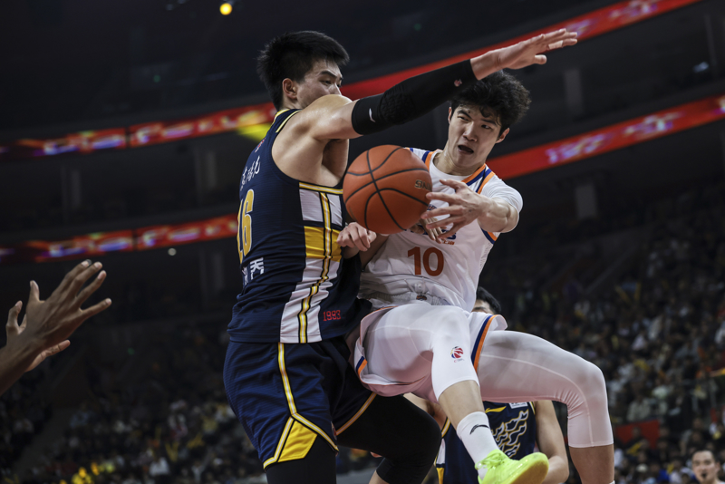 新华社相片,东莞(广东),2026年2月3日\n 2月3日,上海久事队球员王哲林(右)上篮受阻。\n 2月3日,在2025-2026赛季中国须眉篮球功绩联赛(CBA)第23轮比赛中,广东东阳光队主场84比94不敌上海久事队。\n 新华社发(郑家雄摄)