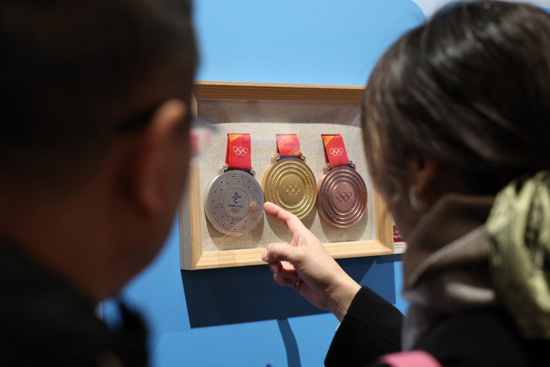 2月4日,东谈主们在冬奥会“中国之家”的“冬奥经过”展示区不雅看2022年北京冬奥会奖牌。 新华社记者 李京 摄