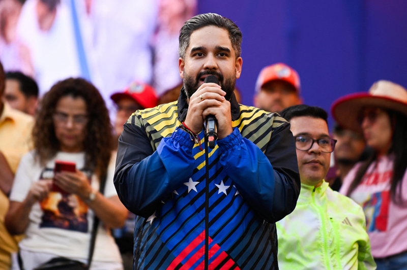 2月3日,在委内瑞拉皆门加拉加斯,委内瑞拉总统马杜罗之子尼古拉斯·马杜罗·格拉在游行活动中发言。 新华社/路透