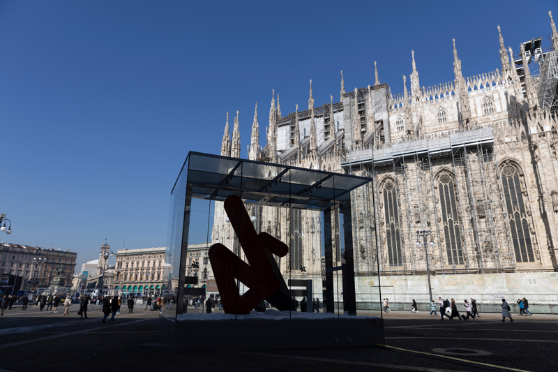 新华社像片,米兰冬奥会、冬残奥会倒计时牌和米兰大教堂。