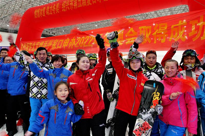 新华社像片,绍兴(浙江),2015年7月31日\n 各地公共庆祝申冬奥到手 \n 7月31日,国度滑雪队暴露员以及滑雪爱好者在浙江省绍兴市乔波冰雪世界滑雪馆庆祝北京联袂张家口赢得2022年冬奥会举办权。\n 新华社发(袁云 摄)
