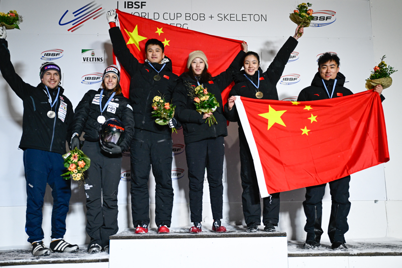 新华社像片,温特贝格(德国),2025年1月4日\n 1月3日,冠军中国组合赵丹(右三)/林勤炜(左三)、亚军奥地利组合弗洛克(左二)/迈克尔(左一)和季军中国组合黎禹汐(右二)/殷正在授奖庆典上。\n 当日,在德国温特贝格进行的2024-2025赛季海外雪车相连会钢架雪车世界杯羼杂团体决赛中,中国组合赵丹/林勤炜以2分00秒87的收成夺得冠军,黎禹汐/殷正以2分01秒28的收成赢得季军。\n 新华社发(海外雪车相连会供图)