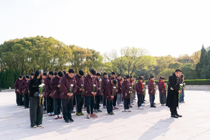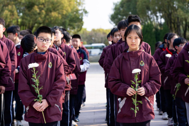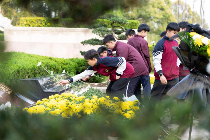 随后,在钱程副校长和胡舒平副主任的组织下,同学们手握菊花,轮番走向顾忌碑。他们神色庄重,轻轻弯腰,将手中的花朵摆放在碑前。