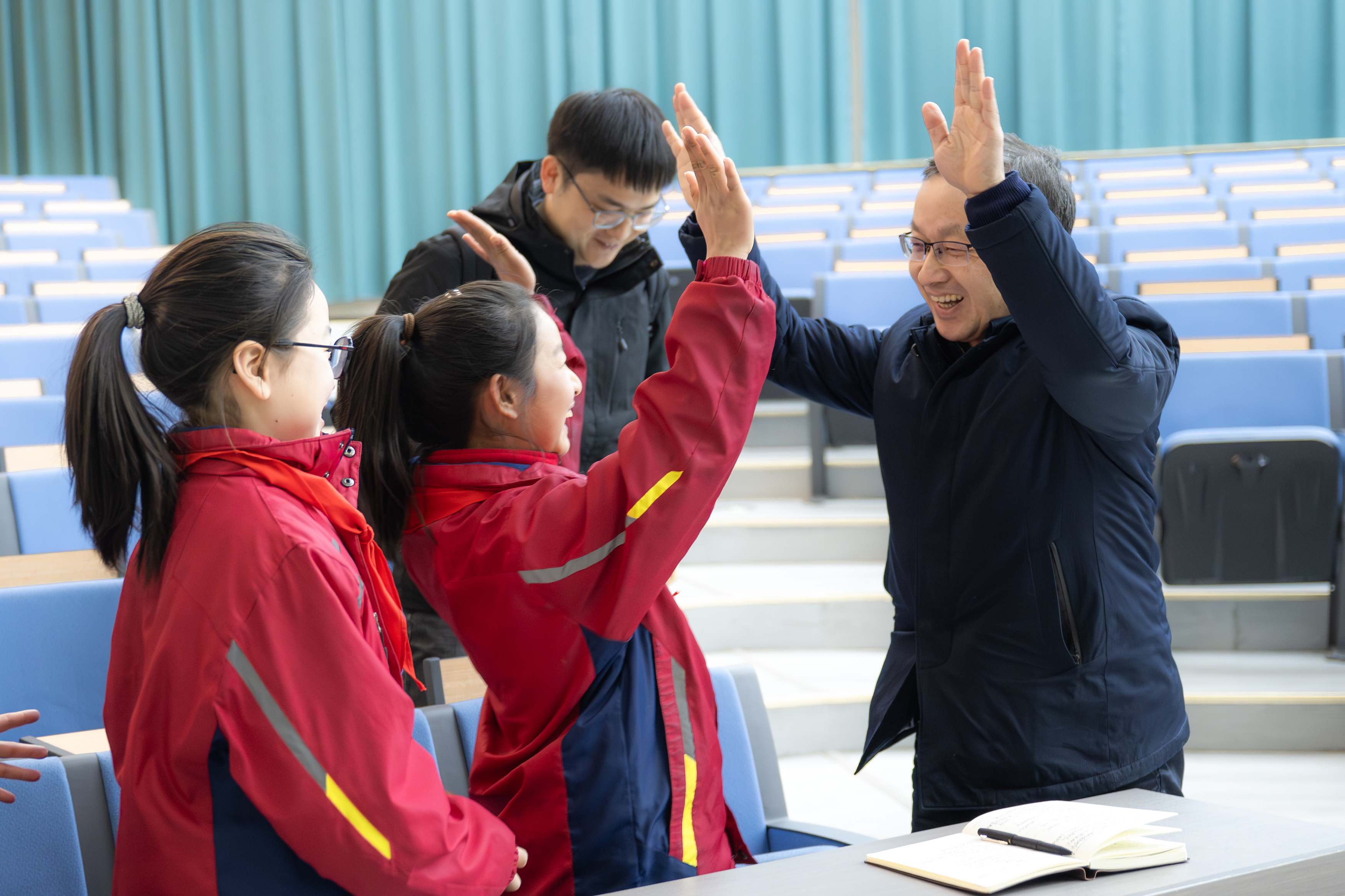 在红安县将军城小学,记者与参加念念政示范课的小学生击掌互动。新华社记者 肖艺九 摄