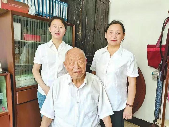 黄冈市级非遗代表性技俩“红色立异歌谣”的代表性传承东说念主梅仙桃(右)与父亲梅基癸、犬子袁晓英合影。(麻城市委宣传部供图)