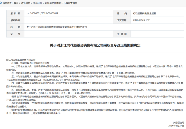 4月10日,浙江证监局线路的行政监管情势决定书自大,浙江同花顺基金销售有限公司(简称:同花顺基金)因存在多项合规问题,被监管责令改正并记入证券期货阛阓诚信档案。