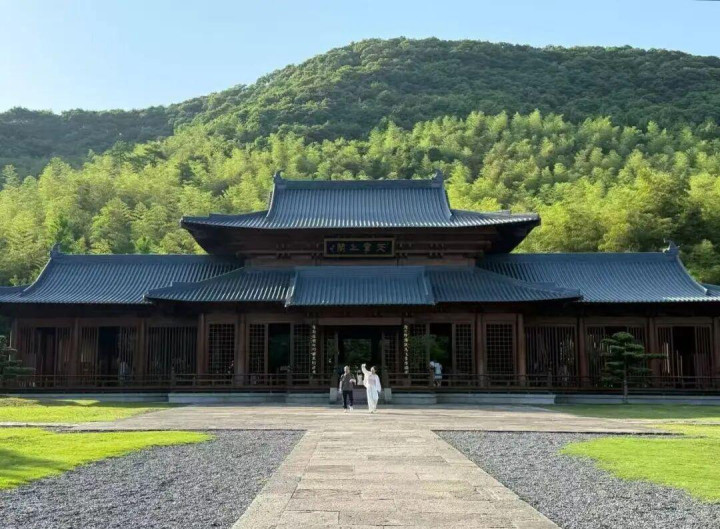 兰亭景区里,非论是精良的曲水流觞,如故王羲之父子手翰的“鹅池”石碑,皆是景区里的经典东谈主文景不雅。1600多年前,王羲之恰是在此处握笔蘸墨,写就“天劣等一转书”。天章寺依靠着兰渚山,青山翠竹为衬,宋风仿木结构细小而简约。据报谈,这里原为存放天子诗文的天章之阁,因宋仁宗赐御书“天章之寺”牌额而得名。复刻版的天章寺临近仅有一根灯杆和监控,寺前广场两侧铺的是草皮与石子,精雅而克制。大片留白的空间与山林绿意相融,阳光透过木格栅洒下斑驳光影,尽显“少即是多”的东方禅意,让搭客在静谧中触摸到千年文脉的温度。