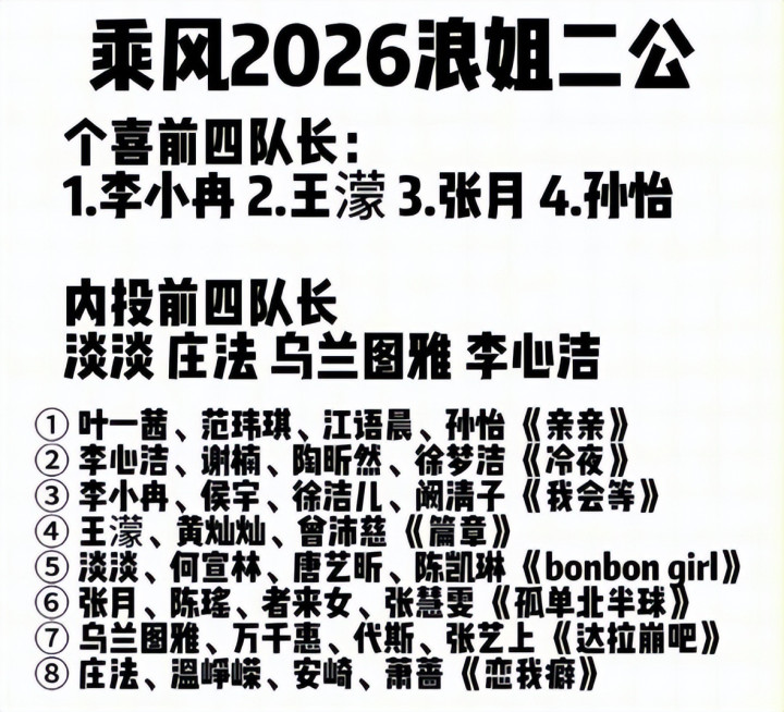 在第二轮舞台公演中,共有8位姐姐成为队长,个东谈主艳羡值名次前四的姐姐平直成为队长,内投名次前四的姐姐也平直成为队长,这么的情况出现后,李小冉、王濛、张月、孙怡、浅浅、庄法、乌兰图雅、李心洁成为队长。