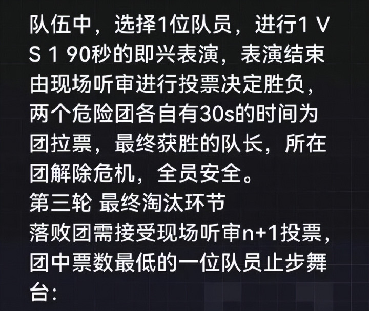 第二轮对决相配蹙迫了,因为端正要在队员内部采取1位出战,进行1对1的随性饰演,饰演范畴后,人人评审决定输赢,落败的团内,将产生一位被淘汰的姐姐。