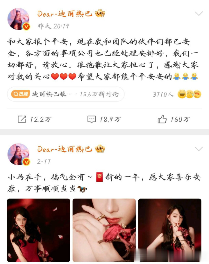 3 月 4 日晚,当全网的心皆悬在嗓子眼时,阿谁熟练的身影终于带着让东说念主宽解的讯息回首了。@Dear-迪丽热巴 更新动态,简易却有劲地向整个东说念主报祯祥:“咫尺我和团队的伙伴们皆已安全……很对不起让各人驰念了,感谢各人对我的存眷,但愿各人皆能平祯祥安的。”